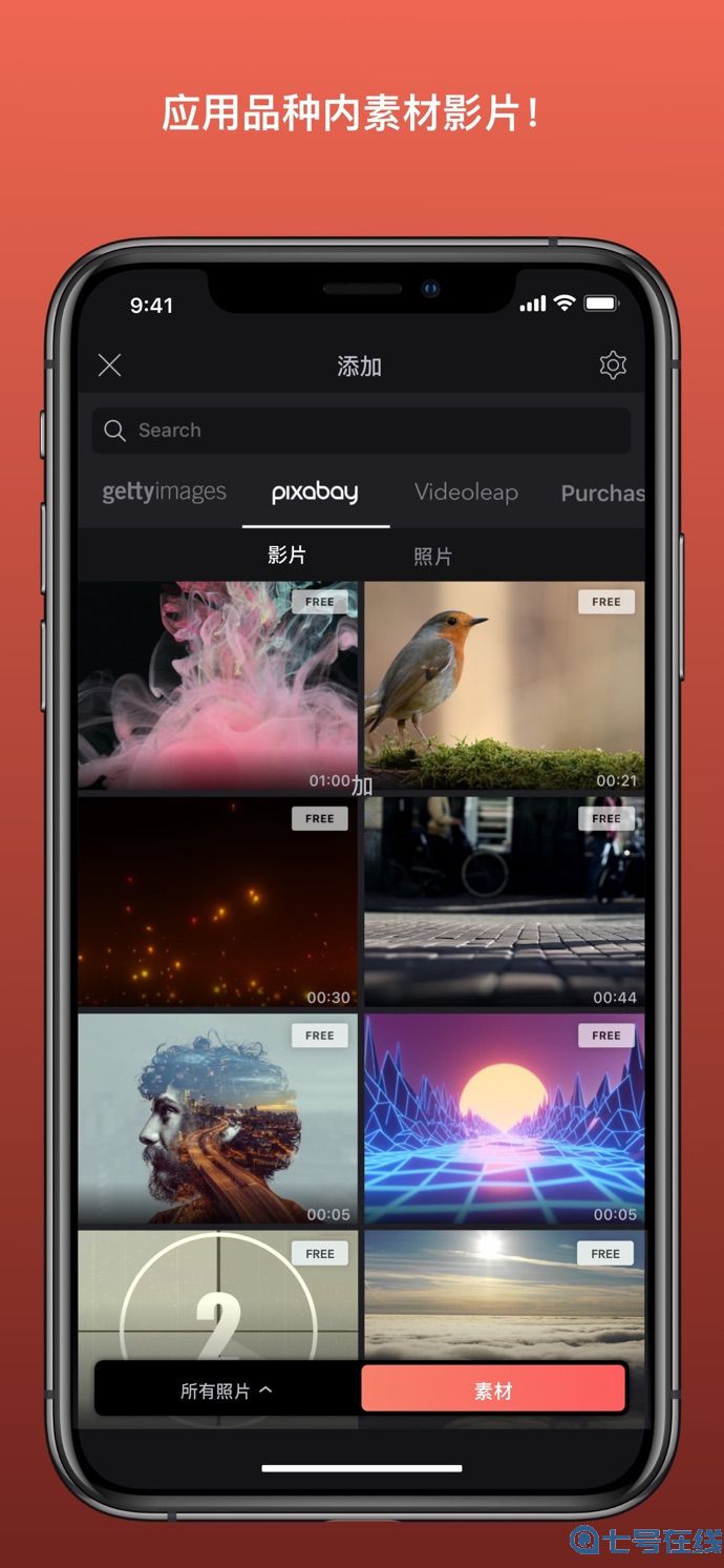应用内素材影片,包括绿屏视频和叠加!