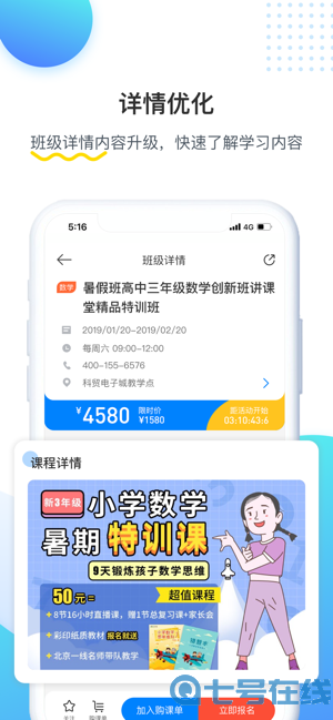 「选课报名」家长可以根据班级类型、老师介绍、上课时间以及上课地点,选择最匹配的老师