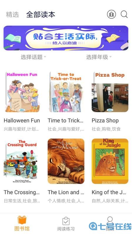 《向日葵阅读》以丰富的读本资源为基础让用户的英语口语能力得到提升,帮助用户完成日常学习任务。软件推出图书馆板块,在这里汇聚着系统收集的所有读本资源,读本从文学与艺术、家庭与朋友、社会、人际关系、自然等展开教学服务。
