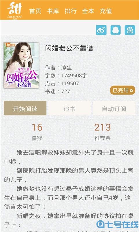 《甜悦读》是一款贴心的小说阅读软件,软件囊括全网优质读物,种齐全,分类清新吗,明了,方便广大用户可以进行快速查阅,同事软件上所有的书记都是免费阅读,没有广告弹窗,喜欢的朋友记得下载甜悦读。