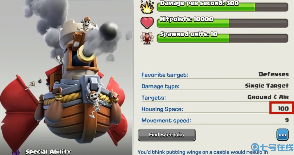 在“部落官方”的视频当中,我们看到了一个在空中飞行的巨大战舰,很多小伙伴对它产生了浓厚的兴趣,于是小白找到了这个战舰的数量,秒伤300、血量1万、最让人吃惊的就是它的训练空间达到了“100格”