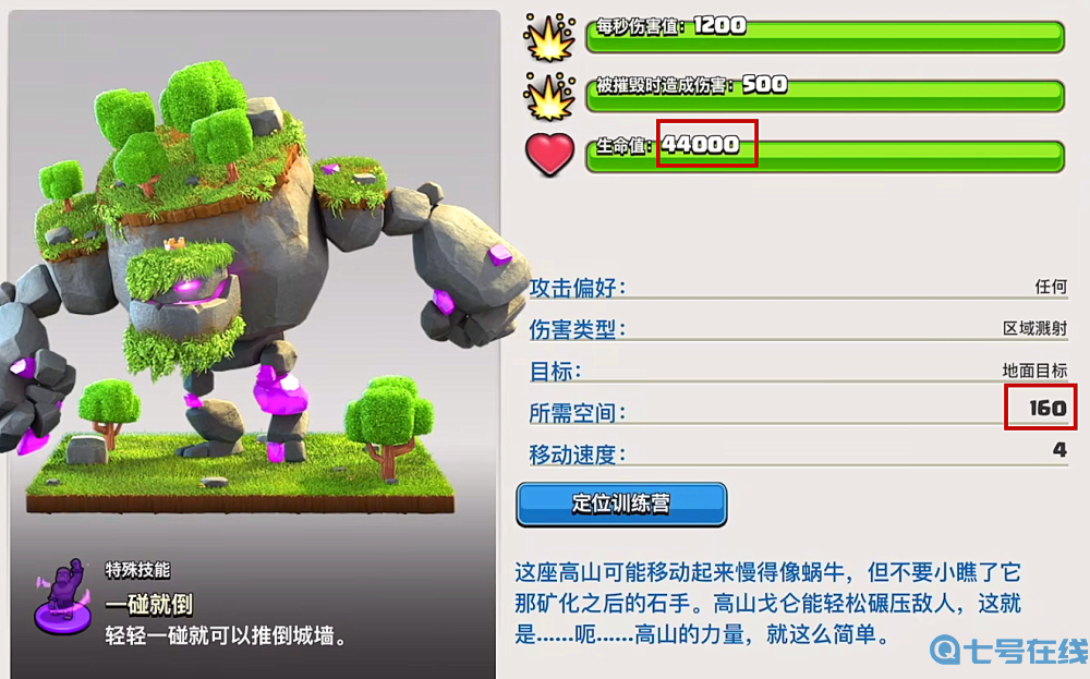 在“官方”推出的动画中,出现了一个巨大的石头人,这个石头人的名字叫做“高山戈仑”他的数据就很夸张了,秒伤1200、被摧毁后造成500点伤害、生命值4万4千、需要训练空间“160格”