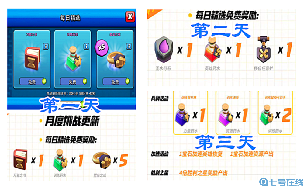 第二天免费的礼物是:圣水符石、英雄药水、铲子。