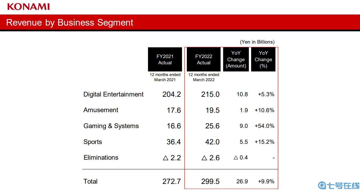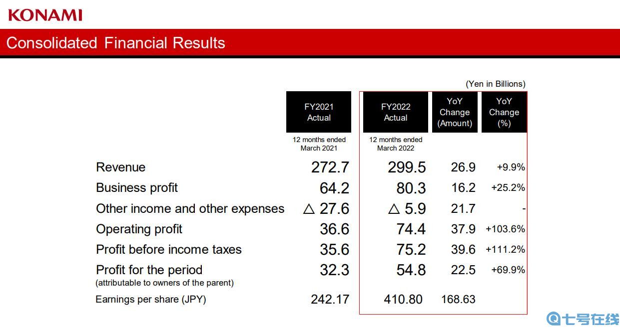 今日(5月12日),科乐美官方公布22财年财报,该财年销售额2995亿日元,相较于去年的2727亿日元同比增长9.9%,营业利润744亿日元,同比增长103.6%。