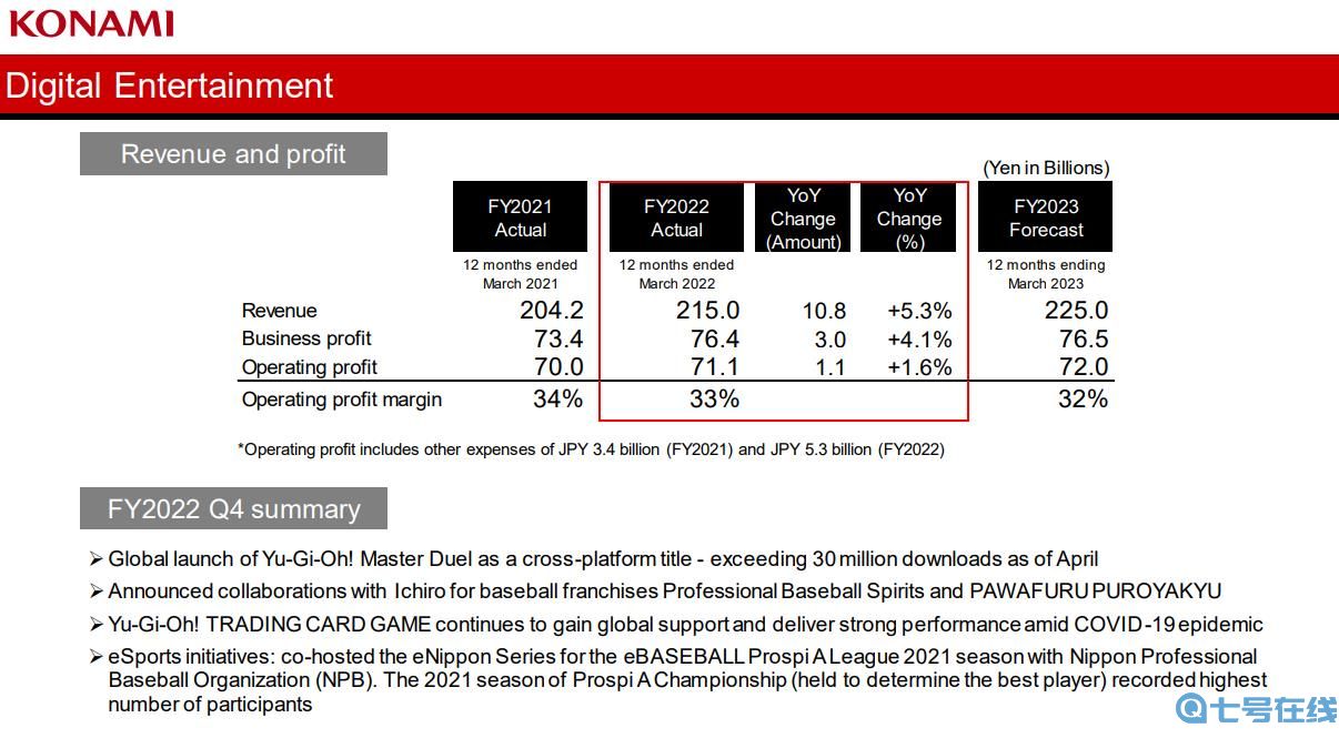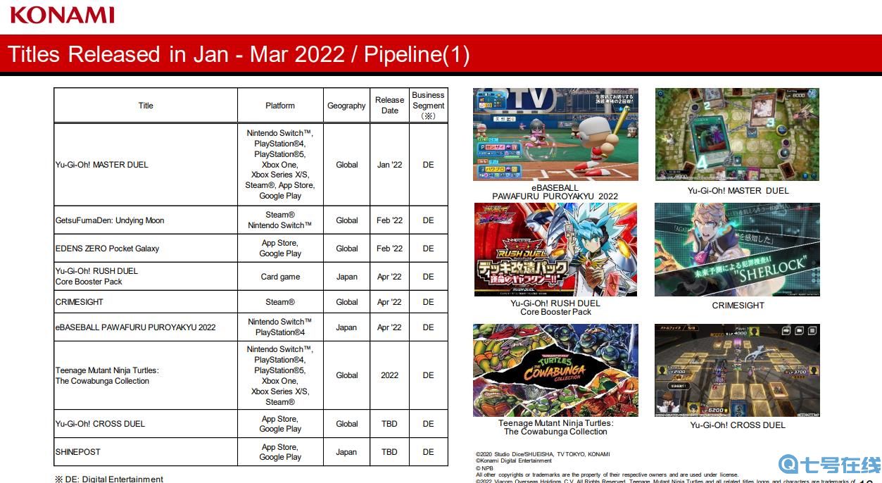 数字娱乐业务全年表现稳健,截止至2022年4月,全球上线的《游戏王 大师决斗》累计下载量已突破3000万,Switch平台游戏《桃太郎电铁 昭和平成令和也是惯例》累计销量也于2022年3月时突破350万份;《eFootball 实况足球2021》与移动端《游戏王 决斗链接》等作品依发展势头良好。