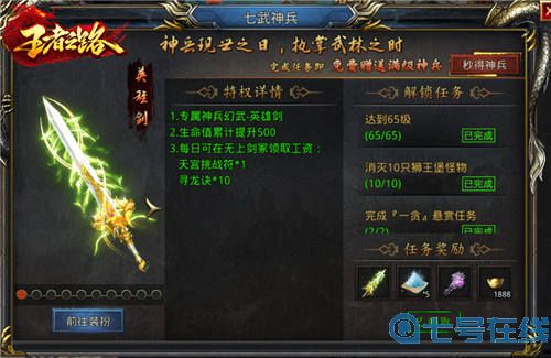 神兵现世,持神兵者可执掌武林!完成任务之后,每位玩家即可免费获赠满级神兵。七武神兵将会给我们带来巨大的属性加成与丰厚福利,神兵还拥有专属的晋升地图,晋升神兵能为我们带来更大的属性加成与奖励!
