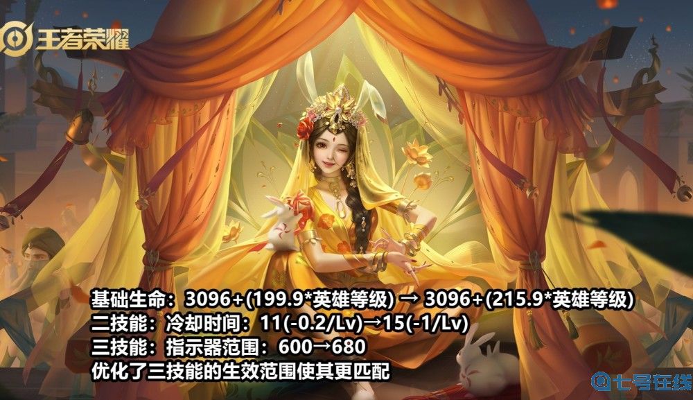 首先是基础生命值加强,每一级提升了16点生命值,满级后总共多出224点生命值。其次2技能冷却进行了削弱,前期技能CD时长增加4秒,后期维持不变。此外还优化了公孙离大招的指示器范围,使生效范围与大招实际范围更加匹配。