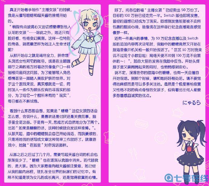 WSS playground宣布,颇受好评的独立冒险游戏《主播女孩重度依赖(Needy Girl Overdose)》销量突破50万套。官方在直播中公开周边企划,包括抱枕、立牌、原画、T恤等。游戏自制作人にゃるら也送出了中文寄语和纪念插图。游戏Switch版将于10月27日发售。
