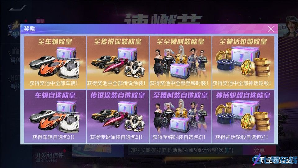 不仅有周年之星闪耀全场,7月8日至7月18日,更有欧皇大奖等你上线赢取!指定时间内完成简单任务即可获取欧皇券,解锁参与周年庆终极抽奖的资格!而在7月16日的NeXT决赛上,全车辆、全传说涂装、全至臻时装、全神话轮毂四项欧皇大奖将惊喜揭晓,此外还有车辆自选、传说涂装自选、至臻时装自选和神话轮毂自选的欧皇奖励随机派送,助你成为周年庆最欧的仔!